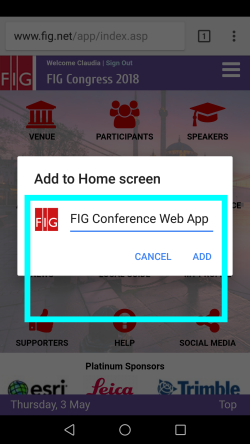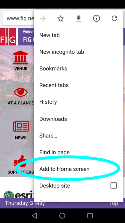 Step 1: Go to www.fig.net/app and click on the dots in the right corner Step 2: Click on 'Add to Home screen' Step 3: Name the App something you prefer and click on 'ADD'