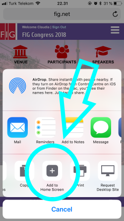 Step 1: Go to www.fig.net/app and click on the share button at the bottom. Step 2: Click on 'Add to Home screen' Step 3: Name the App something you prefer and click on  'Save''