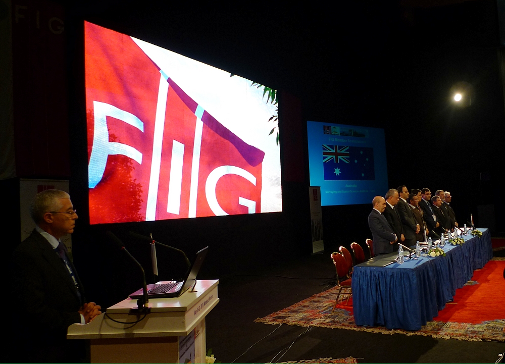 Welcome greetings were also presented by President Sarkis Fadous, Arab Union of Surveyors, President François Mazuyer, Fédération des Géomètres Francophones, FGF and Vice President Fausto Savoldi, Mediterranean Union of Surveyors, UMG that all organised their general meetings during the week. The FIG fanfare and the national anthem of Morocco brought festivity to the opening ceremony moderated by Prof. Mohammed Ettarid, Chair of the local organising committee.