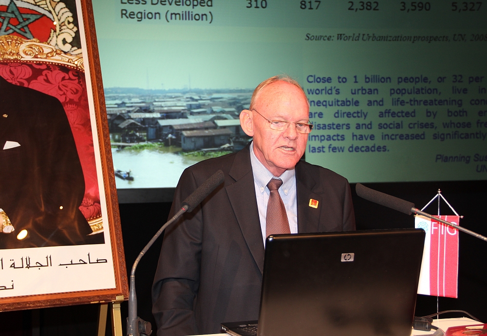 The last plenary session focussed on environmental issues and sustainable development. It was co-chaired by Mohammed Timoulali, UN ECA and John Hannah, Chair of FIG Task Force on Surveyors and the Climate Change. The session started with presentation of Mohammed Nbou, Secretary of State, Energy Mines, Water and Environment "Problematiques environnementales et developpment durable au Maroc "Operationalisation de la CNEDD". The FIG perspective for surveyors was given by Prof. Stig Enemark, who was appointed as FIG Honorary President in Marrakech. His address "The Climate Change Challenge - The Role of Land Professionals" provides a good background for the FIG agenda for the coming years. The third presentation was presented by Kamel Ayadi from Tunisia who in his paper "Elargissement du Concept de la Durabilité: Gouvernance et Intégrité pour une Meilleure Durabilité du Développement" discussed among other corruption.