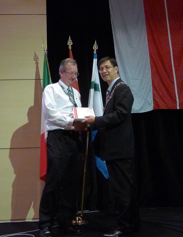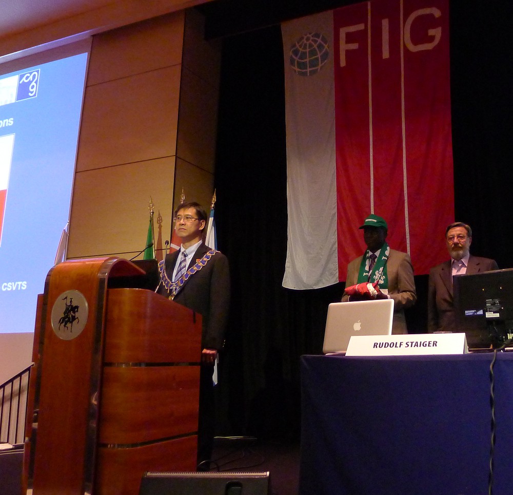 At the flag ceremony the FIG banner was given from CNGeGL, Italy to NIS, Nigeria that will host the Working Week in 2013 in Abuja.