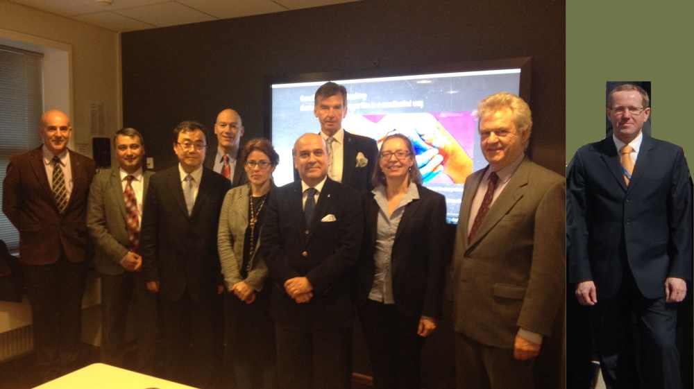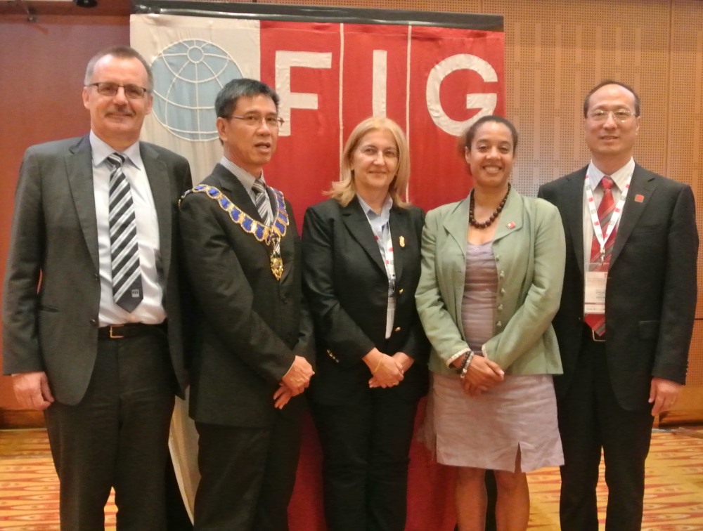Current FIG Council 2013-2014 (from left): VP Rudolf Staiger, Germany, VP Chryssy Potsiou Greece, President CheeHai Teo, Malaysia, VP Pengfei Cheng China, ACCO rep. Yerach Doytsher. VP Bruno Razza Italy was unfortunately not present for the photo session.
