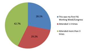 Despite specific areas of dissatisfaction, hereunder the lunches and conference facilities, this year’s participants - or at least the respondents in the survey – are generally happy with the Working Week.  The majority of the participants who completed the survey have earlier attended a FIG Conference. We are pleased that delegates keep coming back; it is the best indicator of the popularity of the FIG Conference. We interpret is positively that 95 percent indicate that they will recommend the FIG Conferences to friends and colleagues.