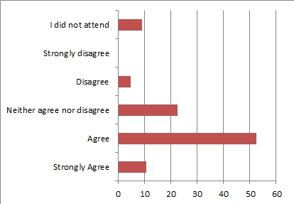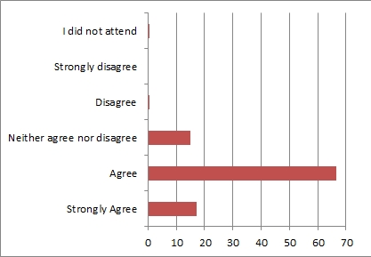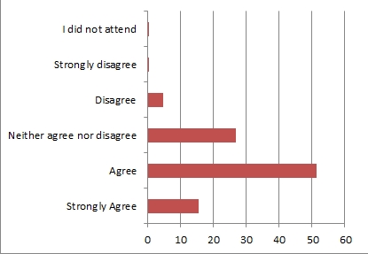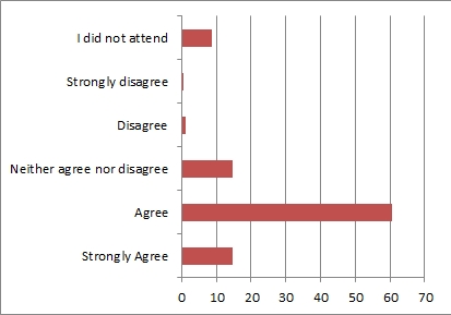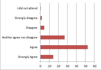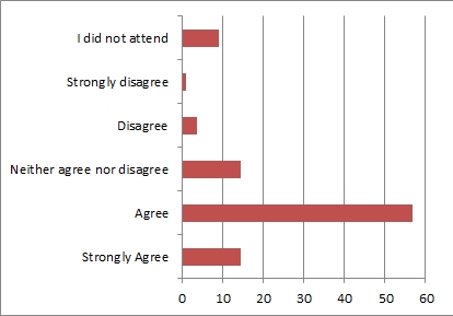 The plenary sessions were rated according to quality, relevance and whether the sessions were rewarding. There was general satisfaction with the plenary sessions, 70 percent of the respondents agreed or strongly agreed that the plenary sessions were relevant, rewarding and of high quality, while only 4 percent disagreed. 10 percent did not attend the plenary sessions.