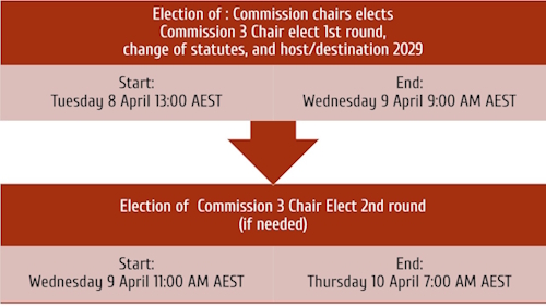 This voting will start on Tuesday 8 April at 13:00 AEST.  If a second round is needed for the commission 3 Chair Elect the election will end on Thursday 10 April 7:00AM AEST (please not this is still Wednesday 9 April in many parts of the world).  The voting rounds are shown in the below image, and please note the time is noted in local time for the Working Week, AUSTRALIAN EASTERN STANDARD TIME: