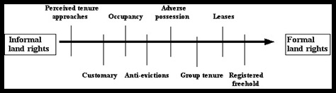 The GLTN see the responsibility of administering land as the task of a range of “informal and formal institutions including government, private and non-governments actors.” It goes on to state “unfortunately conventional government land administration systems do not provide security of tenure to the majority of the world’s people. They rely on documents or computerised systems that record information…but most people do not have legal documents for the land they use or occupy….and limited land records and lack of information cause dysfunctionalities in the management of urban and rural areas, from the household up to national government level, which impairs the lives of billions of people” (UN-Habitat, IIRR, GLTN, 2012, p. 4). The work of GLTN and UN-Habitat is also directly connected to the land rights continuum (as below) and embedded in the recently published Land Administration Domain Model (LADM) international standard from FIG and ISO.