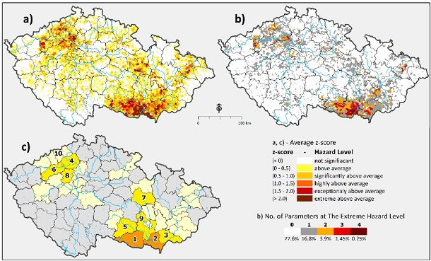 Spatial distribution of multiple hazard analysis is shown in Fig. 9. The percentage of territory at where the hazard level is highly above average or worse is 8% (Fig. 9a). Within the multi-criteria analysis, was simultaneously examined how a large part of the territory of Czech Republic meets at least one of the criteria for an extreme degree of risk (Fig. 9b). This combined approach provides a good overview of the areas where the hazard level is significantly higher than the rest of the territory. The last step of this analysis was to define the territory that may be considered to be at a particularly high risk. As such, was considered a territory where the average value of the z-scores was higher than 1.5 and/or where at least two criteria had z-scores above 2.0 to be at a high risk. These criteria are met by 4.5% of the territory of Czech Republic. As Fig. 9c shows, two areas can be pinpointed as the most at risk. These most vulnerable regions constitute areas where attention and resources should be given the highest priority.
