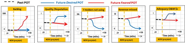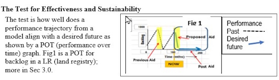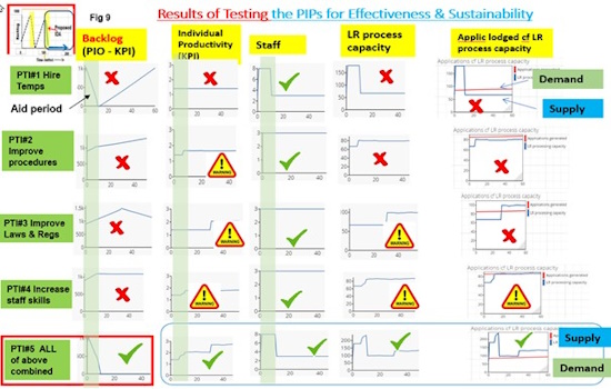 The test was outlined in Sec 1.0 and Fig 1. Fig 9 shows the results of testing the PIPs. [PIP and PTI are used interchangeably]. The first column shows the POTs for backlog, the PIO (a KPI, key performance indicator), from testing each PIP. Other columns show POTs from the model for other KPIs/PIs. The other KPIs/PIs can be identified from an understanding of the model shown as Fig 3. Together they indicate the likely effectiveness and sustainability of the PIPs. Desired future POTs can be compiled for the other KPIs/PIs.