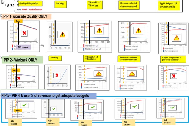 The improvement strategy should be based on PTI#5 as it is the only one where the backlog trajectory from the model aligns with the desired future for the PIO, and other KPIs/PIs are improved . The improvement strategy in summary is: (1) with aid – 5 temporary staff for 10 mths to assist clear backlog; 3 TAs (technical advisers) for 6 mths to improve procedures, laws, increase staff skills and productivity; executives engage with politicians to pass changes to laws: (2) post aid - executives engage with politicians until laws passed; managers monitor actual performance to targets (covered in Example 3 Sec 4.0).