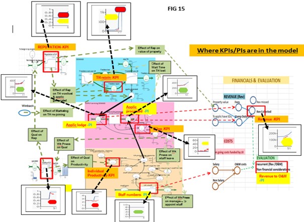 4.3 Using the sim model as a living business model (LBM) during implementation [Fig 5] Fig 15 shows where KPIs/PIs are in the model. Also  shown are POT graphs for KPIs/PIs showing actual performance (red lines) and targets (blue lines). The time is 7 mths after aid, 23 months after quality upgraded; 8 months after winback campaign finishes.