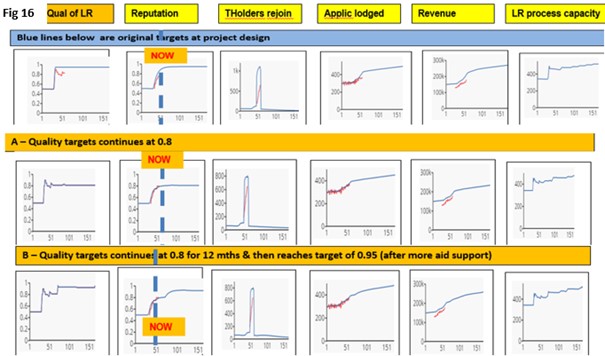 Evaluate and revise performance targets if necessary – Managers decided to explore two What Ifs. What might be the target performance of dependent PIs if  (A) quality stays at 0.8? (the current achieved level); or (B),  continues at 0.8 for a further 12 months when it reaches 0.95? (due to further aid). Fig 16 shows model results for the two cases. The course of action selected is a management decision.