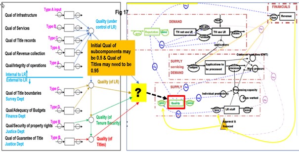 A SCS  for incorporating subcomponents into “the system to be improved” - Fig 17 shows the LR system of Fig 11, Example 2) on the right hand side, and the subcomponents of quality and the responsible agency on the left. Each subcomponent (assumed for the example) is shown as a stock with an inflow and outflow.