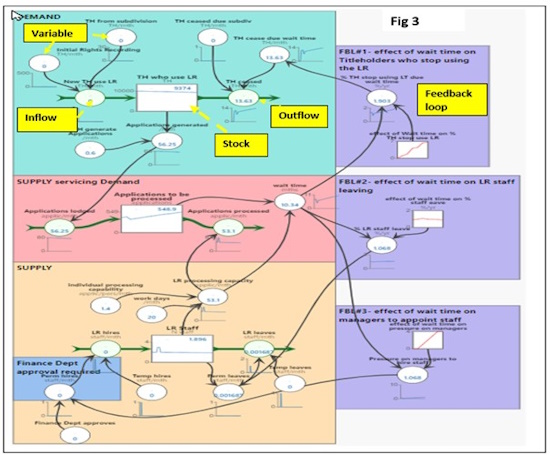 There are three main parts to the system;- a Demand side generating applications; a Supply side with processing capacity; a Supply servicing Demand which can give rise to waiting times, which in turn gives rise to feedback loops (FBL). FBL#1 is where titleholders cease using the LR because of long waiting times. More in Sec 3.