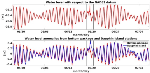 Figure 9 Top panel: water levels referenced to NAD83 datum. Bottom panel: water level anomalies from the bottom package and a nearby station.
