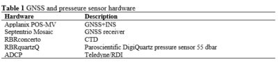 As we mentioned in the introduction, details about seafloor data validation and datum computations will come in a follow-up paper. We demonstrate the repeatability of our results using the GNSS PPP and pressure measurement approach for determining water levels by acquiring data in two experimental setups that utilized an affordable GNSS receiver, RBR Concerto CTD, RBR Digiquartz pressure sensor, and a Teledyne/RDI ADCP (all oceanographic sensors housed in one single underwater package), in separate deployments. Table 1 lists the sensors and the manufacturer’s name. It bears repeating that the GNSS+INS sensor is only required to verify the affordable GNSS PPP results offshore.