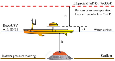 Figure 3 The operational concept uses a GNSS receiver installed on either a buoy or a USV and a bottom package containing a pressure sensor to estimate seafloor separation from the ellipsoid.