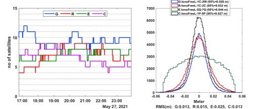 Figure 4: Left panel: number of satellites included in GipsyX PPP solution at Experiment location #1. Right panel: carrier phase residual distribution and the corresponding RMS values.
