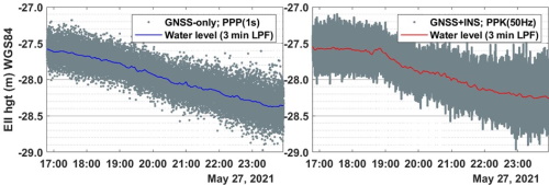 Figure 5 Instantaneous water levels (gray dots) at experiment location #1. Left panel: PPP results (1 Hz) from affordable GNSS. Right panel:  PPK results from survey-grade GNSS+INS (50 Hz). The blue and red lines are the water levels using the 3-minute LPF cutoff.