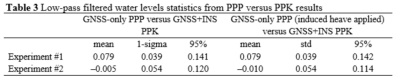Table 3 summarizes the statistics comparing PPP results with and without induced heave applied relative to the GNSS+INS solutions. Comparing the 95% ordered statistics in the third and sixth columns reveals that the induced heave effect is less than 1 cm for a short lever arm.