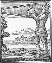Figure 2 illustrates the first of a series of thoughts Hooke had in 1694 which came very close to being a description of accurate stereoscopic mapping about 200 years before stereo-photogrammetry became feasible. The first thought was about how inaccurate and incomplete sketches often made by mariners of newly discovered shorelines could be improved so that others visiting the places later could navigate more safely. In 1666, only a few months before his life was changed by the Great Fire, Hooke had described to the Royal Society some uses of a "picture box". By 1670 he had made and used a camera obscura which presented an upright and unreversed image to the user (Cooper, 1996). Then, in 1694 it came to his mind again when he was thinking of mapping coastlines by simultaneous horizontal and vertical angular measurements from the ends of a measured baseline aboard ship. He proposed two double motion two-foot (about 0.6m) sextants with telescopic sights mounted on pedestals using what would now be called constrained centring for measuring the angles to features on shore. He said the accuracy of measurement of the separation of the centres of the pedestals was paramount and that they should be at the vessel's stern and bowsprit head, or otherwise as far apart as possible. He said that the observers should agree beforehand on an observing programme and that when observing they could communicate with one another by pre-arranged signals on a line between them. The juxtaposition in his mind of perspective projection for accurate recording of directions and simultaneous intersection of observed directions for locating the positions of features is the concept of analytical photogrammetry, but without photographs.
