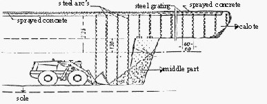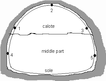 The NATM prefer the technology of shared cutting – calote, middle part and sole (Fig.1). Each of these sequences can be once more shared. The profile can be given by arcs with continuous curvature. The primary cheek is build by sprayed concrete, steel grating and steel arc’s which are completed with rock anchors. To dimensioning of the primary cheek will be given not only by the thickness of the sprayed concrete especially by using of different number and type of the anchors. The right dimensioning of the primary cheek is controlled by group of geotechnic and geodetic measurements.