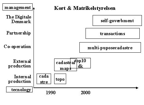 To illustrate the dependencies between the different stages of development and competence I’ll show you what has happened to the National Survey and Cadastre Denmark (KMS) over the last ten years. The period where we converted our maps to digital form and entered the marked for digital data and information.
