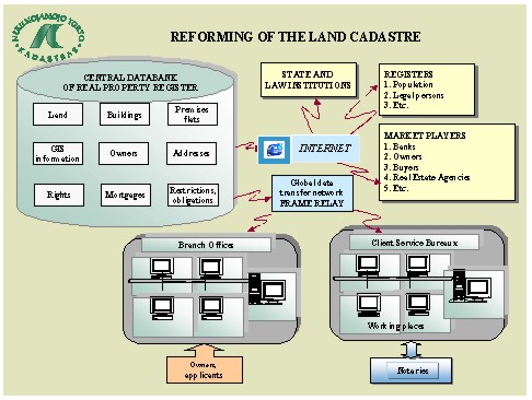 The core of Real Property Register is being developed at the State Land Cadastre and Register. There are also some possibilities for communication to the central system. Central system is connected to the Statenet (a TCP/IP based communication network) and through this network CLCR Branch Offices and Districts Client Service Bureau can access the central system, and through this network Internet can be accessed. Statenet is also used by agencies such as Economic Police, State Security, General Prosecutors office if they need to access the central system. SLCR have built a user interface to the central system by using Internet techniques. In order to access the information via this solution user have to have identity and a password.