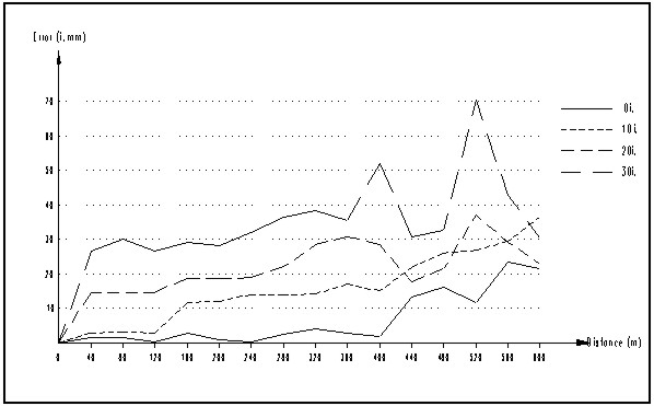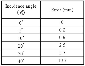 Figure 4. Distance error by Incidence angle 4. MEASUREMENTWe selected the asphalt-paved road equivalent to total 650m near Namchun-Dong, Sooyoung-Ku, Pusan, Korea as the measurement object area. We used TOPCON's GTS-701, Total Station as the measurement device, and in order for us to compare the accuracy, we also used TOPCON's first class leveling device as the leveling device, and the specifications for each device is as shown in the following Table 2 Table 2 measurement device