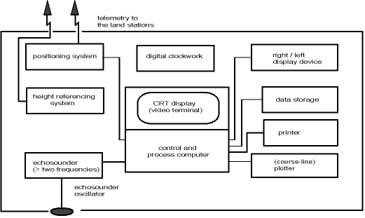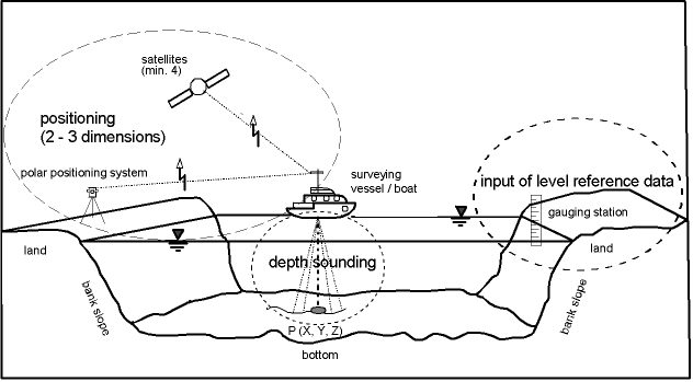 Figure 1: Principle of surveying of waters by vessel or boat The extent and the accuracy of surveying tasks is to be optimizes, depending on the demands brought forward by the multi-users of the data, for instance in the field of maintenance dredging, development or new construction of waterways. Mostly the surveys are so-called multi-purpose surveys, with the intention to optimize the quality (i.e. accuracy) of the measurements and to chose the most economical method. 2.2 Surveying System for "Peilungen"On the Federal Waterways surveying systems for "peilungen" are used. This surveying system is installed on board the measuring vessels. This system has 3 main components, which are equal to a higher data processing level by the stream of data sampling: