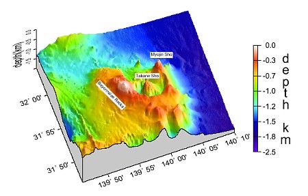 Myojin-Sho is a submarine volcano on the Izu-Ogasawara Ridge located about 450 kilometers south of Tokyo and about 50 kilometers south of Aogashima Island, which lies at the southernmost rim of the Izu-Shichito Islands (Fig.1). The first eruption was witnessed in 1869, and in the 130 years that followed, more than ten volcanic activities were recorded with repeated cycles of eruption and the appearance and disappearance of a new island.