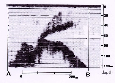 In this survey, however, a record that suggests a gushing of bubbles near the summit was obtained (Fig.2). The ocean bottom seismograph recorded minor earthquakes, the epicenters of which are located near Myojin-Sho. Thus, the authors consider that volcanic activities continue to take place today though the activity level is low.