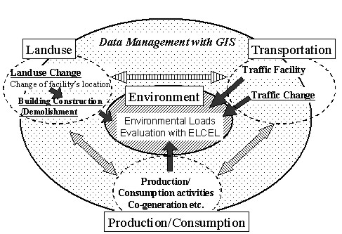 Figure 1 shows the overall sources of environmental loads and their relationships with each other. There are three activities, landuse, transportation, and production and consumption. These are related with each other. For example, when landuse changes, the traffic pattern also changes. Then, this change causes the landuse change in the long run.