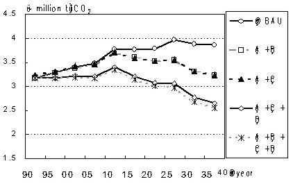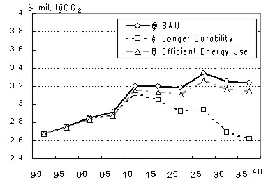 Figure 5 shows the transitional change of the amount of LC-CO2 of 1.BAU, 2.Longer Durability and 3.Efficient Energy Use from the housing sector.