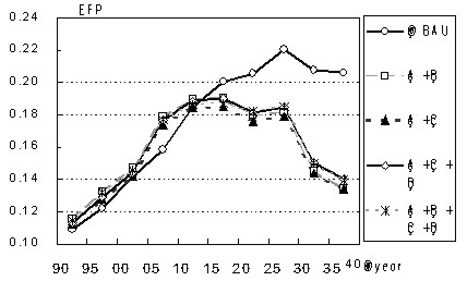 Figure 6 shows the result of the change of EFP from the housing sector from 1991-95 to 2036-40 in BAU. The value of EFP from the construction stage increases gradually. The average floor space of the detached house is about two times larger than that of the apartment house. However, the materials used in the apartment house are mainly steel and concrete. This brings about more environmental loads compared with the Japanese typical wooden detached house. As the share of the detached house decreases and the share of the apartment house increases in 50 years, this causes the increase of the EFP of the construction of houses. The value of EFP of the waste increases dramatically by 300% and the share of the waste in the total value is 54.1% in 2036-40. Evaluating by EFP, the waste turns out to be a major source of environmental loads.
