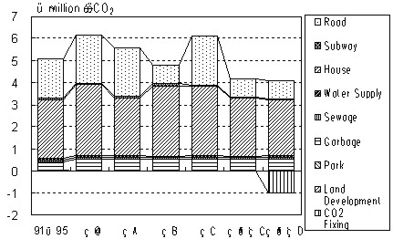 Figure 8 shows the transitional change of the LC-CO2 and also Figure 9 shows LC-EFP from the all facilities considered. 4.Concentration Measure is that the households whose houses are demolished move to the zone where there are major railway or subway stations. 5.Green Belt Measure means that the brown fields, which are made by the movement of the households with 4.Concentration Measure, are changed into the green park. The CO2 fixing rate of the green park is set to 30t-C/ha?year (Ichimura 1999).