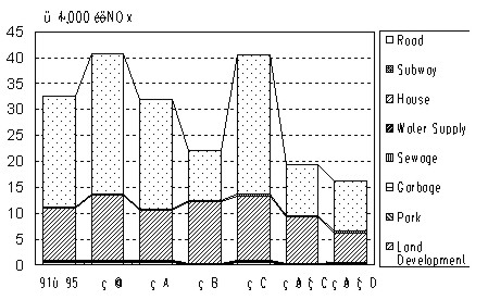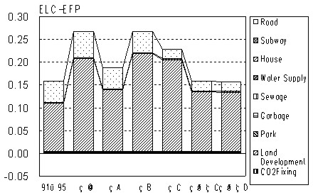 Figure 10 to 12 show the Extended Life Cycle (ELC) CO2, NOx and EFP respectively. In terms of ELC-NOx, which causes the air pollution, the vehicle is the major source. In terms of ELC-EFP, housing sector is the major source. When applying the combination measure, 2 to 5, it can reduce ELC-CO2 by 39.1%, ECL-NOx by 51.9%, and ELC-EFP by 1.1% (BAU 1991-95). Also this measure reduces ELC-CO2by 49.8%, ECL-NOx by 61.4%, and ELC-EFP by 41.5% compared with the BAU in 2036-40.
