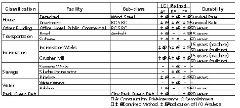 Table 1 shows the facilities considered, the Life Cycle Inventory (LCI) methods applied for each stage, and the durability of each facility. The development of green belt that fixes the carbon dioxide is dealt with. In terms of sewage and water supply works, the construction and demolishment stage is not mentioned. As these facilities have been changed continuously, replacing some of the machines or widening reservoirs, construction and demolishment stage is included in the maintenance stage. The durability of each type of house is given by the survival rate of each age, which is mentioned in BUILDING COHORT MODEL.