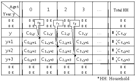 Figure 2 shows the calculation method of building cohort model. By using 1-rt, which represents the demolishment rate of age t (rt represents the survival rate of age t), total number of demolished houses in year y can be described as Σt(1-rt)Ct,y. By inputting the number of new houses exogenously which is represented as C0,y+1, total number of houses in year y+1 can be described as Σt+1Ct+1,y+1.