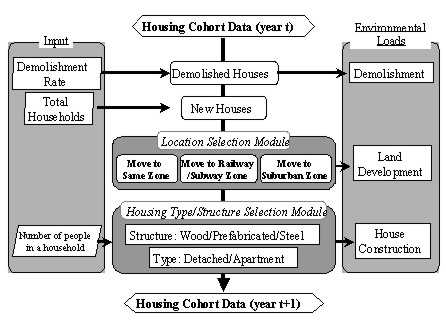 Figure 3 shows the structure of model constructed. It is applied to each zone and each type of houses in Nagoya. This model has two modules such as locational selection module, and structure selection and house type selection module. Through these modules, the effects of the measures can be analyzed.