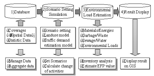 This system is composed of four modules, a) database, b) scenario setting and simulation, c) environmental load estimation, and d) result display. Database module manages the spatial and non-spatial data. Spatial data is managed as coverage and non-spatial data is maintained as normal database. By using the function of the database software through GUI, these data can be aggregated for each purpose. Scenario setting and simulation module is used for scenario setting through GUI. Then it is used for calculation of building cohort model, and traffic demand estimation and allocation. Environmental load estimation module calculates the amount of the environmental loads and EFP, using the result of the calculation by Scenario setting and simulation module. Display module displays the result of the calculation of each module.