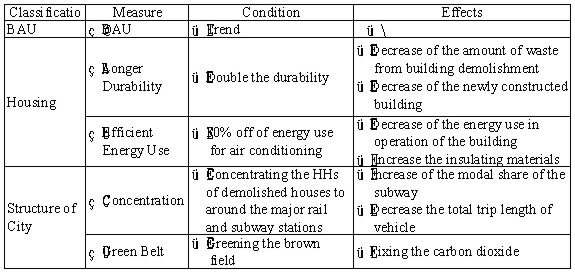 The measures applied are listed in Table 2. The start year is 1991 and the final year is 2040. The calculation is conducted in every five years and the calculated values are five year total. BAU (Business As Usual) means that all facilities will change according to the trend change and the characteristics of the traffic such as modal share are constant. Measures for housing (2 and 3) and measures for structure of the city (4 and 5) are not only tested as a single measure, but also are tested to see the effective combination.