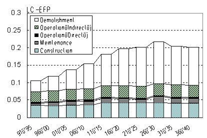By BAU, LC-EFP increases by 89.0% in 2036-40 (BAU 1991-95). On the other hand, Measure 2-5 brings about relatively low increase by 21.2%. The reason why the result of the Each Measure set is almost similar is that each Measure set contains 2.Longer Durability, which dominate the value of LC-EFP.