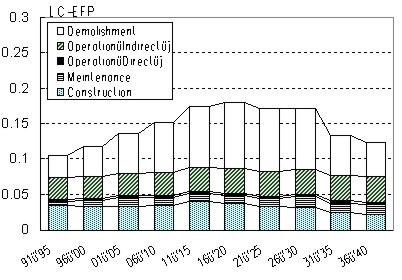 BAU shows that in the fifty years from 1991-95 to 2036-40 the amount of LC-CO2 increases by 21.0%. Longer Durability Measure shows that until 2010 it increases almost same direction as BAU but after that it goes downward and finally decreases by 2.1% (compared with 1991-95 of BAU) and by 19.1% (compared with 2036-40 of BAU). In terms of Longer Durability measure, the amount of energy use increases by 2.9% (1991-95 BAU) and decreases by 15.4% (2036-40 BAU). The amount of NOx decreases by 6.2% (1991-95 BAU) and decreases by 23.7% (2036-40 BAU). Also the waste from building demolishment increases 51.8% (1991-95 BAU) and decreases by 65.0% (2036-40 BAU). In the long run, Longer Duration measure is efficient to reduce the environmental loads.