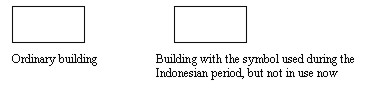 c) If a public facility or building from the Indonesian period remains damaged and unused, the symbol for the public facility or building during the Indonesian period is used. However, bold lines are used to represent the building, to indicate that it is not classified according to its present ownership and use.