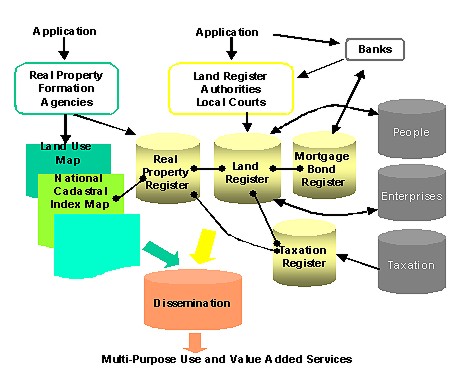 The establishing of the Swedish system was a project that involved several ministries and agencies on central, regional and local levels. Information from the Real Property Register (the Physical cadaster), Land Register (the Fiscal Cadastral) are integrated within the system.