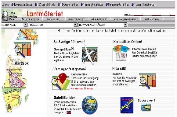 www.lantmateriet.se also provides two services especially designed for estate agents and banks, etc. These services are called 'FastighetsSök' [property search] and 'KartSök' [map search], and enable users to obtain information on the owners, tax value, addresses, etc. of a particular property by giving an address or clicking on a map. To use these services, you first need to sign an agreement with the National Land Survey of Sweden. The e-commerce site is in Swedish only.