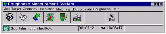 OBJECT'S SURFACE ROUGHNESS MEASUREMENT USING A HIGH RESOLUTION DIGITAL CAMERAHyosung LEE, Yangdam EO, Yongil KIM and Kiwon AHN, KoreaKey words: AbstractThis study aims to present an extraction of the three-dimensional positions and precision measurements of an Object's surface roughness using stereo digital image data obtained from a high resolution DCS 420 digital camera. For real-time processing, a primary window operating roughness measurement system was constructed by means of Visual basic 6.0 in Windows. This system is composed of six modules; image edit, control point survey, bundle adjustment, automatic matching, three dimensional positions generation, and roughness measurement. As the analysis results of measurement accuracy for a digital camera that uses this system, the roughness error of the normal distance between the best fitting reference surface obtained by the least square method and sample points in the ideal plane or surface did not exceed ±0.1mm 1. INTRODUCTIONIndustrial products or instrumental components and structures of various manufacturing methods do not correspond indispensably to a design plan. Also, because surface roughness for quality control is a very important physical quantity and closely associated with the character of the material, it should be measured in the sub-millimeter order. Especially, the manufactured stone is used in the construction materials sectors, also, because the roughness of manufactured stone is very small, a precision measurement method must be used to obtain accurate values. Since most of the methods for surface roughness precision measurement measure very small segments of metal or assembly machines in the laboratory, structures of forms such as the manufactured stone are unsuitable for measurement. So, the digital close-range photogrammetric technique which can be measured directly on the field site is considered to be an efficient method. In addition to this technique should be measured as accurately as possible to the extent of sub-millimeter order, if using a high resolution digital camera which can directly download to a notebook computer in the field, can quicken the process and make it more effective. This paper aims to construct a stone's roughness measurement system using a digital camera and Microsoft Visual basic 6.0 of Window environment for real-time measurement. Also, after acquiring digital images of the ideal plane and surface stone are scarcely roughness using the DCS 420 digital camera, surface roughness was measured using the reference surface that was computed by the least square method, and the measured result values were compared with the result values by the Rolleiflex 6006 metric camera for evaluating the processing capability of the surface roughness measurement of the DCS 420 digital camera. 2. CONSTRUCTION OF A PRIMARY INTEGRATED ENVIRONMENTIf subjects that utilize surface roughness measurement by the digital close-range photogrammetric technique are constructed independently from the integrated environment, this can quicken the process and make it more effective. Thus in this paper, a primary roughness measurement system is constructed that uses a digital camera and Microsoft Visual basic 6.0 of Window environment for real-time processing. A menu module on this system was constructed as sub-menus that image viewer, survey of control points, geometric correction, bundle adjustment, auto matching, computation of three-dimensional positions, and surface roughness, after the main screen menu was constructed using a Multiple Document Interface form for convenient use. In the case where a sub-menu consists in the main screen menu, the main screen menu provides workspace in the application program for the sub-menu screen. Figures 1 and 2 show the flow chart and main screen menu of the constructed system.