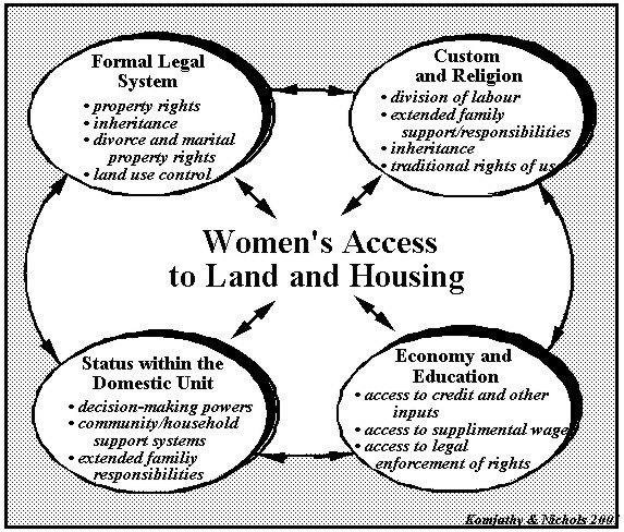 According to the Women's Summit [UN, 1995] findings in most societies women have very unequal access to, and control over land, housing associated resources, and basic infrastructure. It has been long acknowledged however that providing food for the family is primarily the responsibility of women [e.g, Crowley, 2001]. Yet women's direct access to land resources, credit, and shelter can be put at risk in programmes such as land titling, formalization of property rights, and even housing or road improvements.