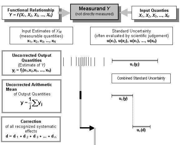 where j indicates the number of determinations for the output estimate y. Its uncertainty is obtained by appropriately combining all u(xi) and is denoted uc(y) , the combined standard uncertainty of the estimate y, the result of measurement. In general this value is displayed, in our example as "measured distance", at the instrument. Unfortunately the process of evaluating y is mostly not known. It is therefore often difficult to determine the combined uncertainty with the desired reliability.