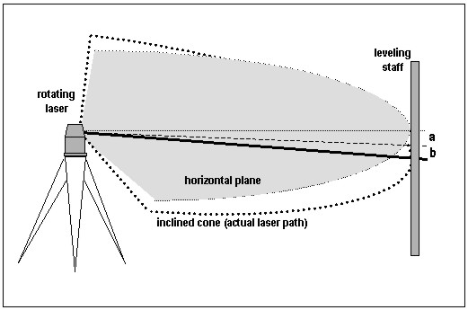 Figure 1: Result of a measurement and its uncertainty If we recognize in the measurement procedure systematic effects and we know the arithmetic rule to calculate its value, we have to apply corrections for compensating these effects. But an important requirement is: Each correction dn has to be significant in size relative to the achieved accuracy of the measurement. Often, measuring instruments are adjusted or calibrated already by the manufacturer or even by the user to eliminate systematic effects before displaying. That means: In a sense the measurement y is already the corrected result, but the uncertainties associated with the corrections are frequently neglected, mostly however they are unknown. A typical example in distance measurement is the additive constant and the short periodic error: In modern electronic tacheometers both components are already considered in the displayed measurement, but the uncertainties are not regarded. This simple example likes to clarify that the transition of the uncorrected output to the corrected result of measurement in practice is fluently. To meet the needs of industrial and commercial applications it is required to provide an interval of confidence about the result of measurement. For this a coverage factor k is defined, with which the combined standard uncertainty is multiplied: the result is the expanded uncertainty ur. The choice of the coverage factor k is based on the level of confidence. The intended purpose is to create an interval about the result, which may encompass a large fraction of the distribution that could reasonably be attributed to the measurand. In the practice, the choice of k = 2 results an interval that corresponds to a probability of approximately 95%. Due to the unknown remaining errors and approximate functional relationships we will have always and in each measuring procedure a remaining difference between the value of the measurand and the corrected result of measurement Y. For this reason it is necessary to introduce an additional uncertainty component us. It depends on the experience of the observer to estimate a representative value for this component. Finally we can state the uncertainty of measurement U of the result by summarizing the two uncertainty components, either squared or linear. 3. THE ISO STANDARD FOR ROTATING LASERSAs discussed in Zeiske (2001) the SC 6 of ISO / TC 172 has treated several standards on field procedures for testing geodetic and surveying instruments. ISO 17123 - Part 6 of these standards – Rotating Lasers – describes two testing procedures, the simplified and full test procedure, both with the objective to determine a representative quantity for the experimental standard deviation of a single measured height difference (instrument – leveling staff). Additionally in the more comprehensive full procedure two systematic errors can be separated from observations: the deviation a, which is a measure for the inclination of the rotating laser plane and the deviation b, which is effected by a non-orthogonality between laser path and standing(rotating) axis (s. fig. 2). The ISO DIS 17123 –Part 6 - still under discussion – describes in detail the whole test procedure and the analysis of the observation series. The result is the experimental standard deviation s ISO-ROLAS as a measure of precision in use for the investigated rotating laser level, referenced to a sighting distance of 40 m. Further more we will obtain the two systematic deviations a and b. It is not common practice to correct the observation during practical field operation. For interpretation of all results – in particular the additional parameters a and b - several statistical tests will employed. Thus the customer obtains objective criteria to accept the accuracy specifications of the tested instrument.